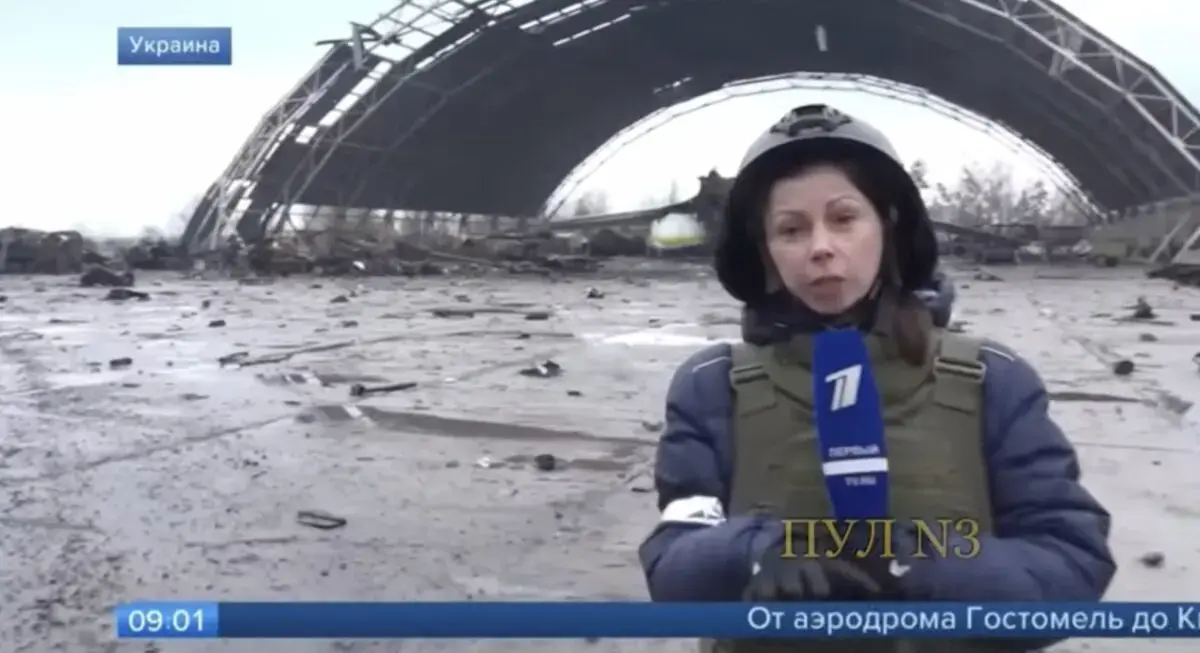 В сюжете Первого канала от 4 марта был показан разрушенный ангар вместе с самолетом «Мрия». Это подтверждает то, что видео опубликованное сегодня пропагандистами, было снято ДО того, как легендарный самолет был уничтожен.