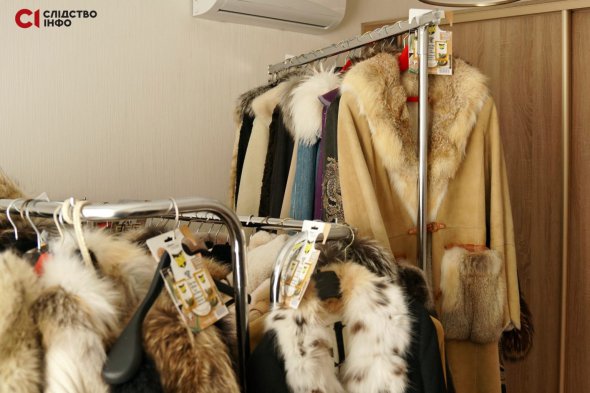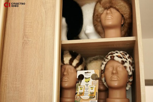 В отдельной комнате хранятся меховые вещи. Журналисты насчитали несколько десятков шуб и других элементов гардероба. На полках - головы манекенов с меховыми шапками.