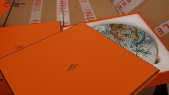 Например, одна эта небольшая тарелка с изображением леопарда стоит 11 тыс. грн. Посуды этой элитной марки в коробках – десятки или сотни штук.