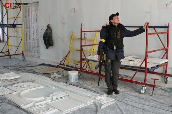Семья Медведчука его реконструировала и перестраивала, поэтому внутри только голые стены и деревянные балки. Вероятно, строители тоже сбежали из дворца, потому что там до сих пор висят куртки и личные вещи. На полу разложен гипсовый орнамент будущего потолка.