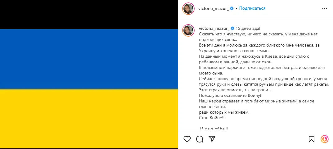 Знаменитая украинская гимнастка Виктория Мазур у себя в Instagram написала эмоциональный пост, в котором поделилась своими чувствами о первых днях войны с Россией.