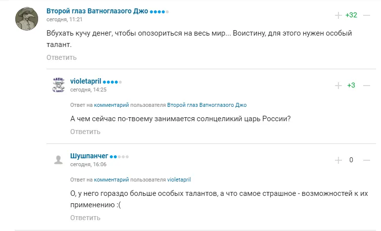 Один из любителей спорта пошутил, что в отличии от Мазепина и его отца-миллиардера, рядовых граждан РФ в обозримом будущем не ждет ничего хорошего. Некоторые предполагают, что в скором времени у них начнутся проблемы с едой.