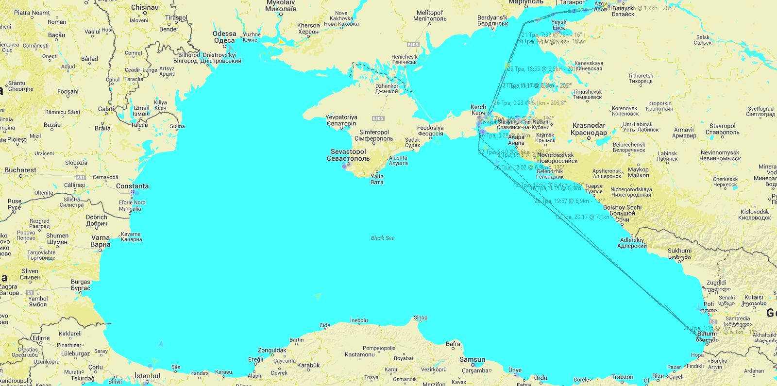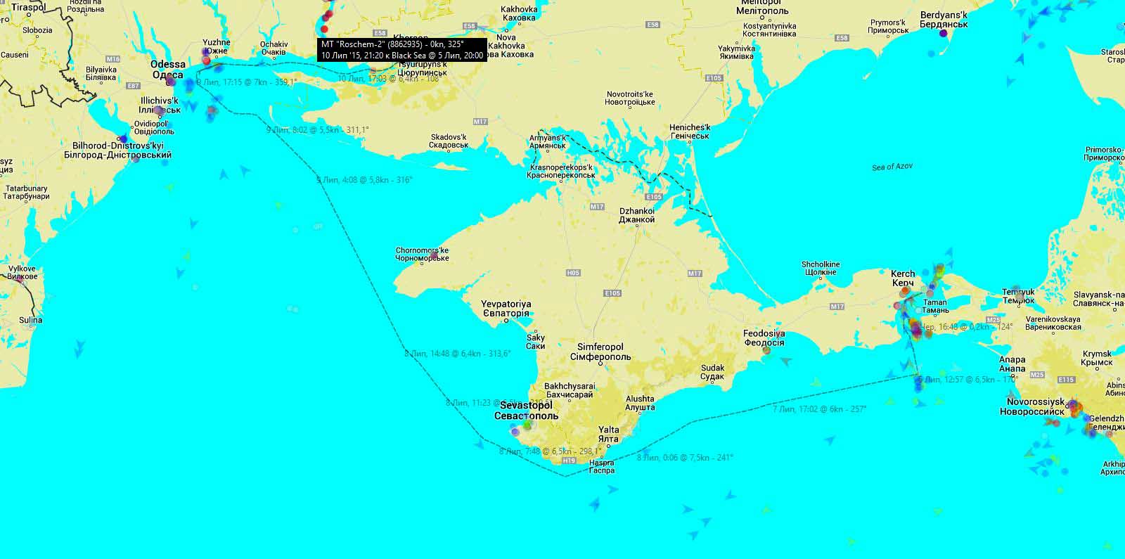 До этого танкер находился в оккупированной Керчи с 23 марта по 7 мая 2014 - по всей видимости, на ремонте на Керченском судоремонтном заводе (карта вверху).