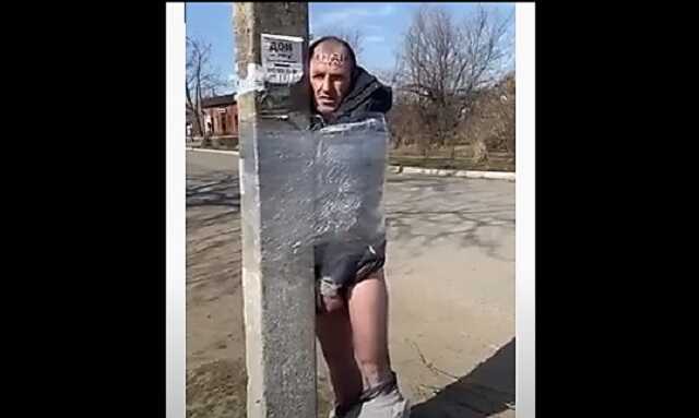 Уличенного на хищении имущества мужчину традиционно примотали пленкой к столбу и спустили с него штаны.