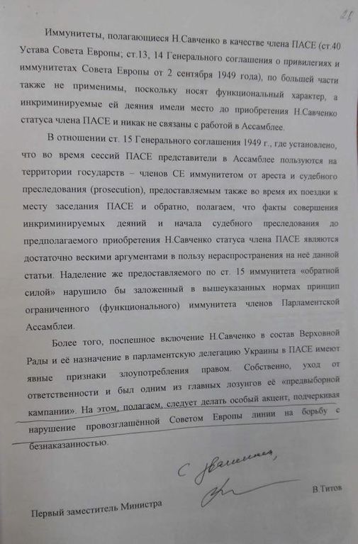 "Преступные действия, по подозрению в которых была задержана Н. Савченко, имели место до ее избрания депутатом Верховной Рады Украины и не могли быть связаны с выполнением ее должностных обязанностей как депутата. В связи с этим наличие у Н. Савченко статуса депутата не предусматривает ее иммунитета от российской юрисдикции в отношении этих деяний в соответствии с международным правом", - говорится в документе.