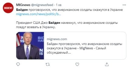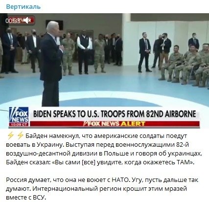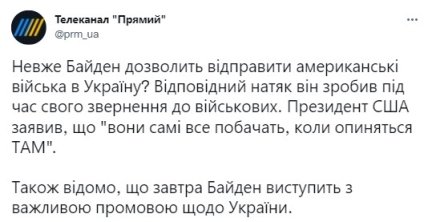 Добавим, что неоднозначные слова президента США Джо Байдена о возможности введения американских военных на территорию Украины как намек воспринял целый ряд интернет-изданий. Однако это вполне можно воспринимать и как предостережение для российских властей, развязавших войну в Украине и ведущих ее с нарушением всех возможных правил и конвенций.