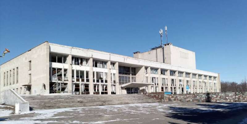 Місцевий палац культури. Снаряд влучив у ліву стіну