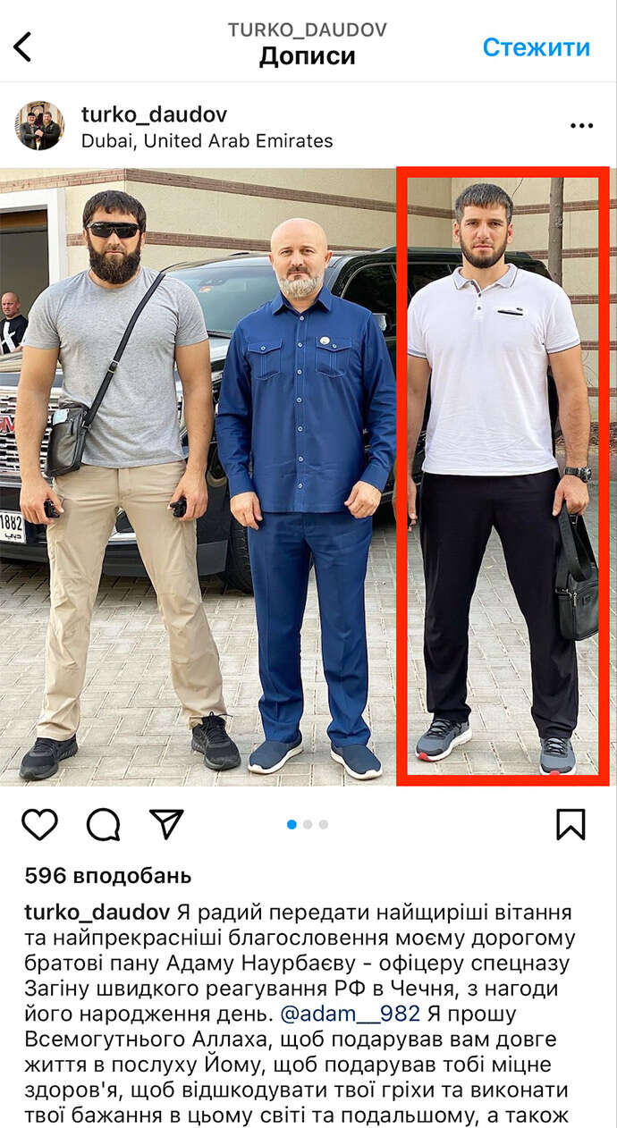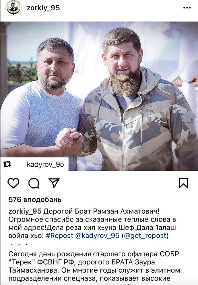 Судя по сообщению мужчины, в котором он цитирует Кадырова, который поздравляет его с днем рождения, это – Заур Таймасханов. Он – старший офицер подразделения “СОБР Терек” Российской Федерации, а проще говоря – офицер кадыровского спецназа.
