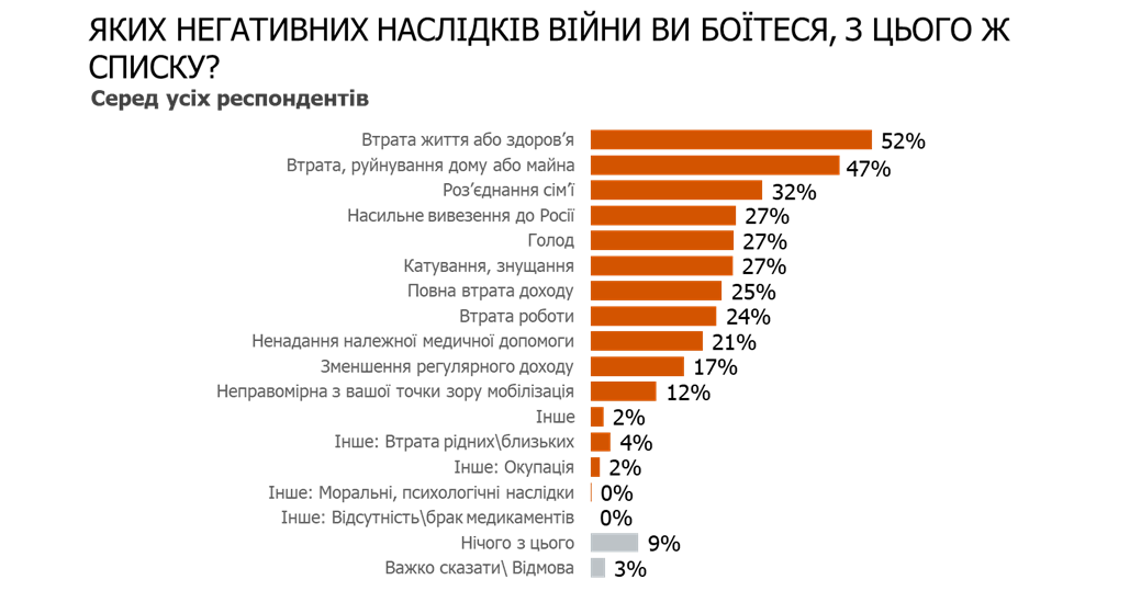 Больше всего боятся украинцы потери жизни или здоровья вследствие войны (52%).