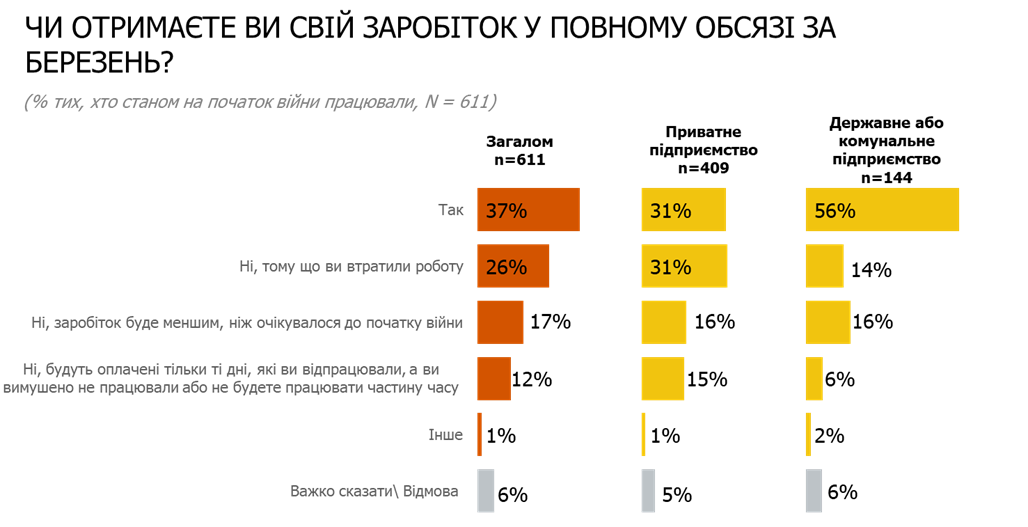 По данным опроса, только 37% украинцев, работавших по состоянию на начало войны, получают заработную плату за март в полном объеме. Еще 29% получат заработную плату частично, а 26% не получат вообще.