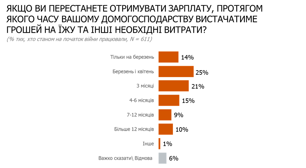 Большинство украинцев говорят, что без зарплаты их доходов хватит на 1-3 месяца: 14% — только на март, 25% — на март и апрель, 21% — на 3 месяца.