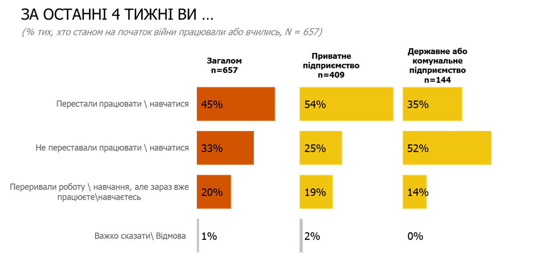 Вместе с тем, положительной тенденцией является то, что 20% тех, кто прерывал работу или учебу из-за войны, сейчас их возобновили. Только треть не переставали работать или учиться из-за войны.