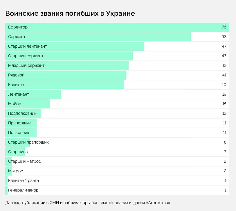 В 443 сообщениях о смертях упоминаются воинские звания. Более половины погибших российских захватчиков — рядовые, ефрейторы, прапорщики и сержанты (291 человек). Более 20% (106 человек) — младшие офицеры (лейтенанты и капитаны). Около 10% сообщений (40 человек) упоминают о гибели старших офицеров, к которым относятся майоры, подполковники, полковники и генералы. По словам Лузина, это соотношение в целом отражает реальное положение в армии страны-агрессора. По его подсчетам, при общей численности армии в 750–800 тысяч человек число офицеров в ней составляет около 180 тысяч.