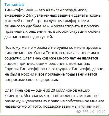 Отметим, что детище Тинькова – один из известнейших банков РФ – открестился от антивоенной позиции учредителя, назвав его взгляды "личной позицией". Вероятно, во избежание гнева Кремля в заявлении руководства подчеркнули, что бизнесмен "давно не является лицом, принимающим решения в компании".