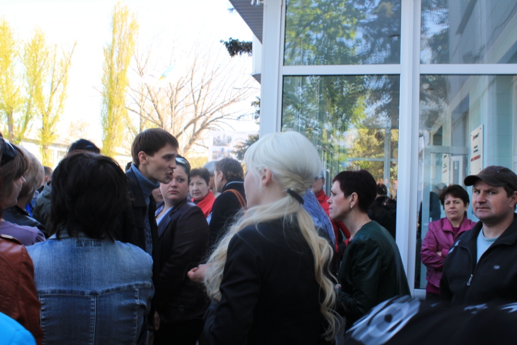 Когда 24 апреля я добрался до Краснодона, было около 9 утра. На площади перед администрацией «Краснодонугля» уже стояли люди. Сколько их было, судить не берусь, не владею техникой подсчета на глаз. Но явно под вывеской «Метинвест» собралось больше 400 человек. В общем, судите сами.