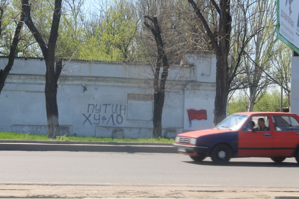 На въезде в Луганск мне попадается на глаза надпись на заборе «Путин – ху#ло». И она красноречиво свидетельствует о том, что даже в городе, в котором на здании захваченного СБУ висят триколоры, есть альтернативное мнение.