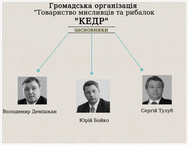 Офіційний запис в єдиному держреєстрі відкриває тільки три призвіща засновників товариства: екс-віце-прем’єра Юрія Бойка, екс-голови Укравтодора Володимира Демішкана та екс-голови Черкаської ОДА Сергія Тулуба.