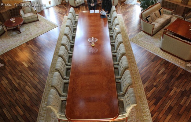 В центрі зали – стіл на 18 персон. "Члени клубу сідали їсти за нього, - говорить директор "Кедра" Микола Гордійчук. – З ними приїздили власні кухарі. Ми лише прибирали за ними. Навіть скатертини возили прати в Межигір’я – були занадто великі".