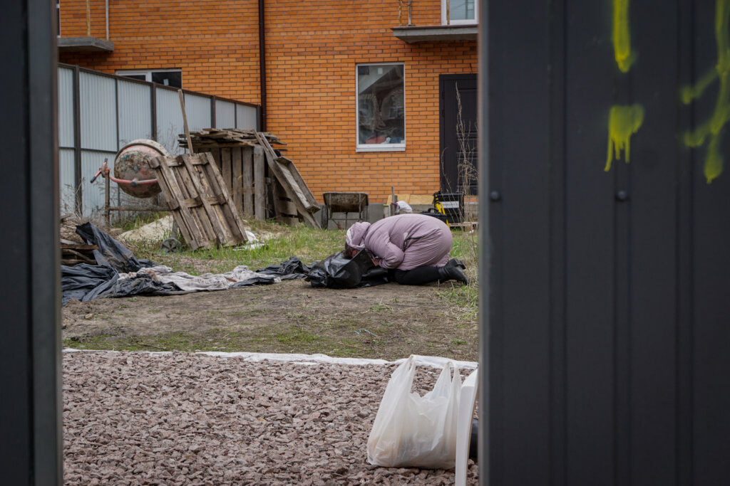Во дворе неподалеку от могилы рыдает пожилая женщина в светло-фиолетовой дутой куртке. Это мать погибшего, она приехала на опознание сына из Черниговской области. Женщина почти ничего не говорит. Следователи переживают, чтобы во время эксгумации она не потеряла сознание, и спрашивают у криминалистов, есть ли у них нашатырный спирт.