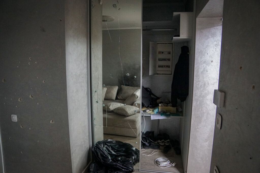 Хозяин квартиры Александр после начала вторжения выехал из Ирпеня, но уже вернулся. Он открывает правоохранителям двери и приглашает внутрь. В комнате на первом этаже видны следы от взрыва, в дверце шкафа напротив с десяток пулевых и осколочных отверстий. Хозяин предлагает подняться на второй этаж. Там на полу возле окна большое пятно засохшей крови и гильза от патрона для охотничьего ружья. Стены, двери и окна изрешечены пулями и осколками.