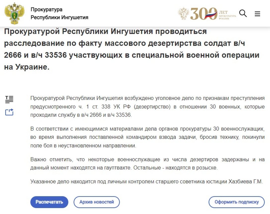 Стоит отметить, что в Сети также был обнаружен ресурс с названием "Прокуратура Республики Ингушетия". В новостной колонке сайта находится сообщение, в котором говорится о дезертирстве 30 солдат, участвующих в так называемой "специальной военной операции на Украине".