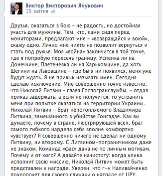 Син екс Президента Віктора Януковича – Віктор Янукович востаннє у Верховній Раді був також 6 лютого. На нібито його фейсбук сторінці – нові статуси. В одному з постів Янукович молодший пояснює, чому не може повернутися в країну. "Мне совершенно точно известно, что Николай Литвин – глава Госпогранслужбы, отдал приказ задержать, а если не получится, то устранить меня при попытке оказаться на территории Украины".