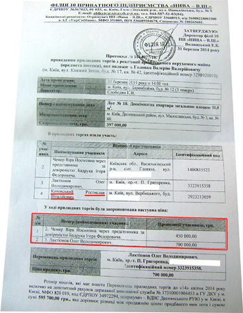 У торгах іще брав участь Ростислав Котовський з пропозицією у 400 тисяч, але, як видно на фото протоколу, запропонована ним ціна не була задокументована.