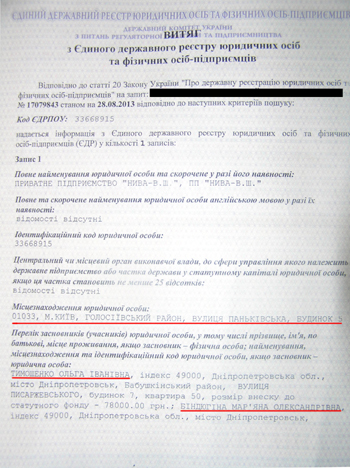 З витягу з ЄДР видно, що офіційними власниками ТОВ "Нива-В.Ш." є Тимошенко Ольга Іванівна та Біндюгіна Мар`яна Олександрівна. Обидві з Дніпропетровська.