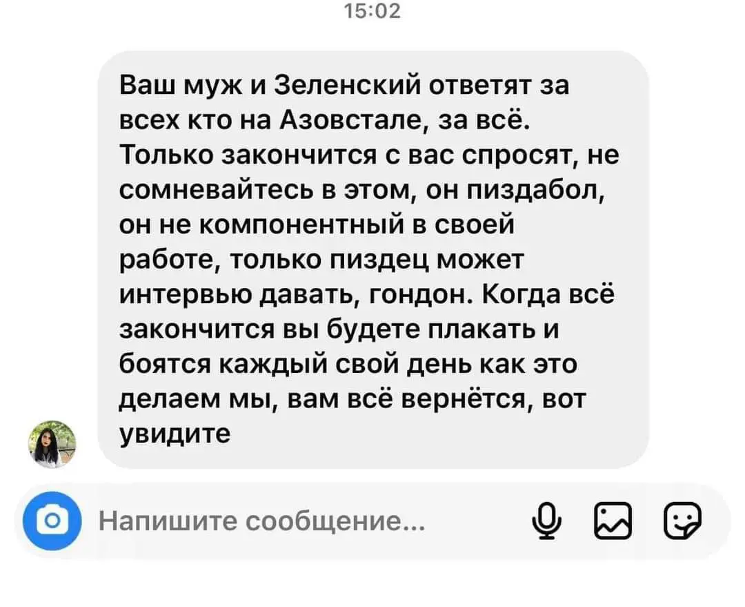 «Моей жене и мне лично вторые сутки идут угрозы от лиц, представляющихся женами и родственниками бойцов «Азова». Нас ждет казнь, меня, ее и наших детей убьют, расстреляют, не простят, что мы сидим в Киеве и списываем «Азов». Но я хочу напомнить этим пишущим, что на «Азовстали» находятся пограничники, полиция, КОРД, 36-я бригада морской пехоты, Нацгвардия и территориальная оборона Мариуполя. Их родственники почему-то никому не пишут и никого не обвиняют», — сказал он.