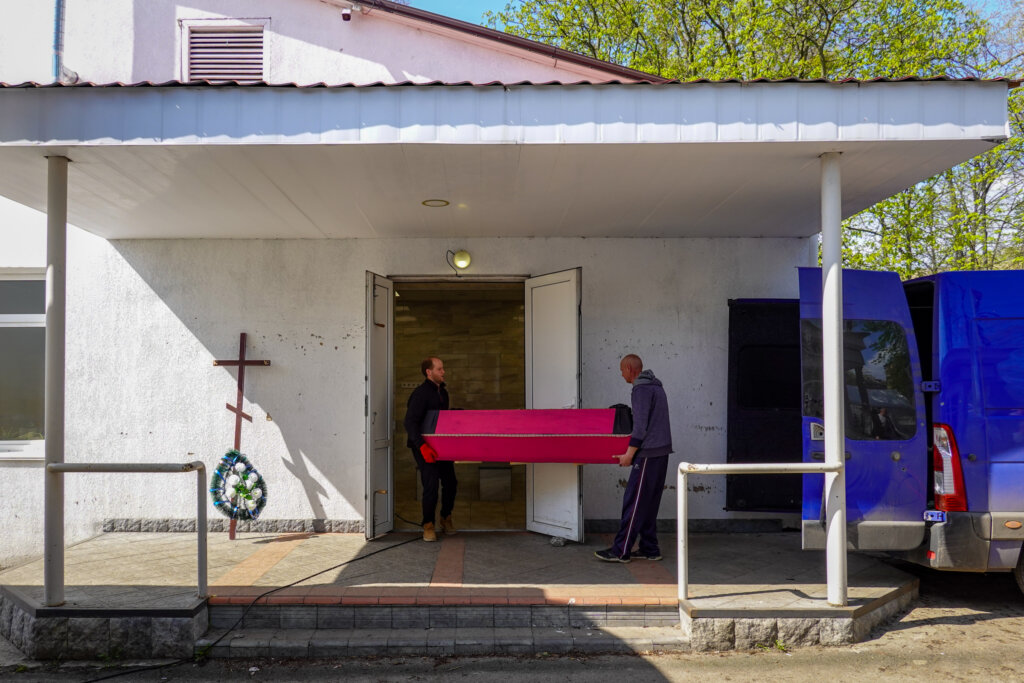 Когда к моргу подъезжают катафалки, это означает, что чье-то тело опознали, и его выдают родственникам для похорон. Все гробы — с закрытыми крышками. У них типовая бордовая тканевая обивка, черная окантовка. Гроб, крест, табличка и похороны — все за счет бюджета громады.