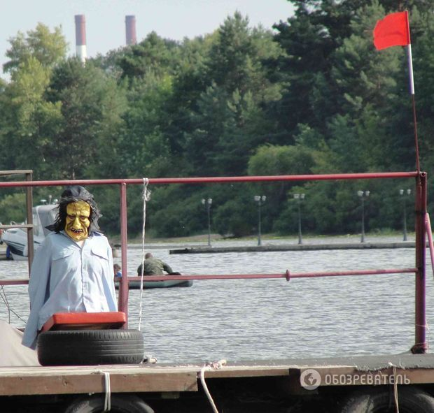 Решаем обойти комплекс с противоположной стороны. Там уже территория другого развлекательного комплекса, здесь установлены мини-домики для отдыхающих, волейбольная площадка, батут… Как и в предыдущем случае, выход к берегу преграждает металлический забор. Охраны на территории не было, только в ста метрах на помосте сидел человек, однако при более близком рассмотрении выяснилось, что это... чучело. Точно так же поступают фермеры, когда хотят отпугнуть "вредоносных" птиц. Но в нашем случае - это защита, по-видимому, от излишне любопытных людей.