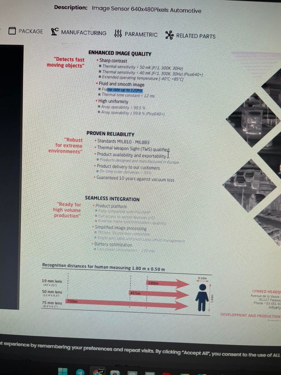 По его словам, после полной разборки российского военного самолета-разведчика и наводчика артиллерии «Орлан-10» (производства 02.2022), захваченного на востоке, в его подвесе обнаружили современную тепловизионную матрицу двойного назначения Lynred PYCO-640-046 (Ulis), произведенную во Франции.