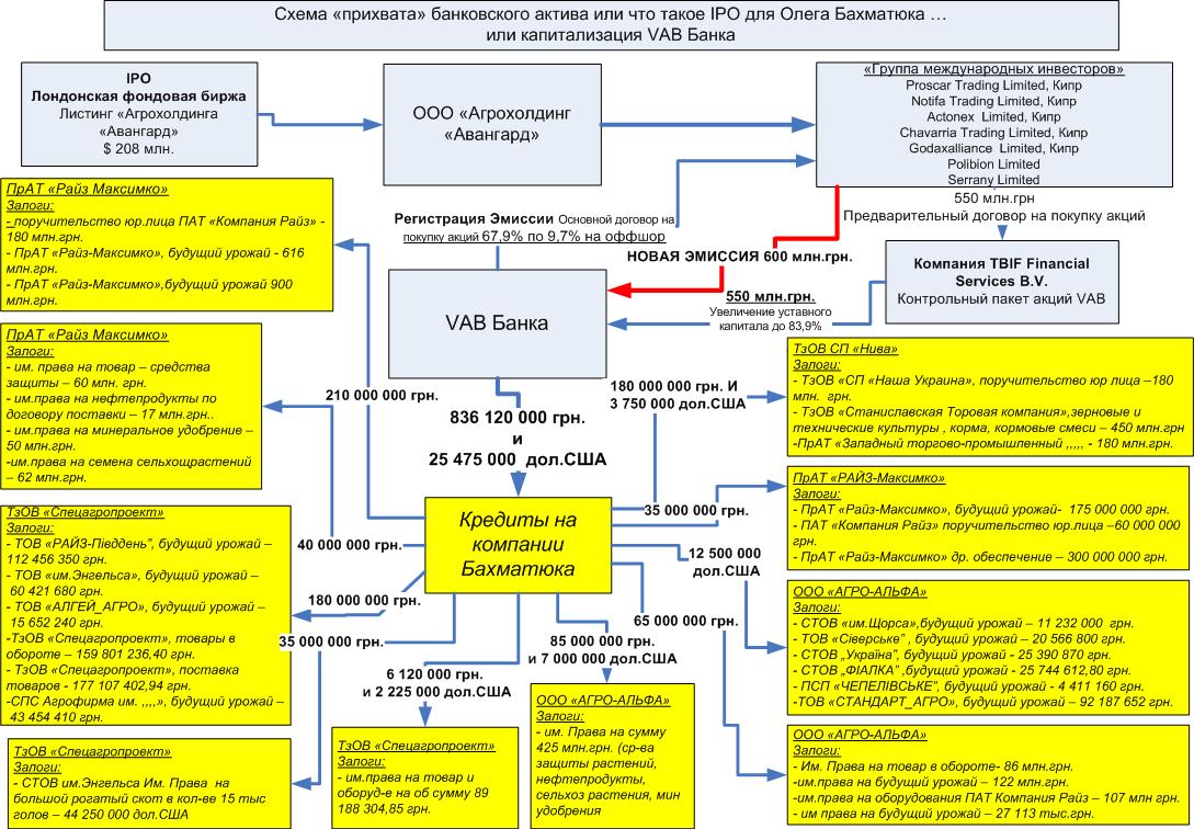 При этом ни Сергей Максимов, ни другие совладельцы VAB якобы не знали, что имеют дело с Бахматюком. Просто к ним пришли киприоты, которых привел «по своей наивности» председатель правления банка и зять Максимова – Петр Барон. Потом все якобы выяснилось, но уже было поздно. В декабре 2010 года в структуру владельцев банка вошел Олег Бахматюк, а в начале 2011 года произошла выдача кредита на миллиард с чем-то гривен. Через эти кредиты, по сути, и были выведены те $200 миллионов, которые Бахматюк взял на IPO.