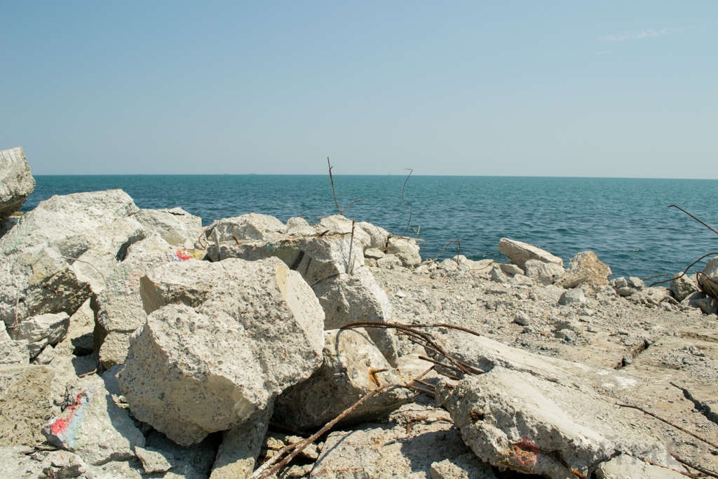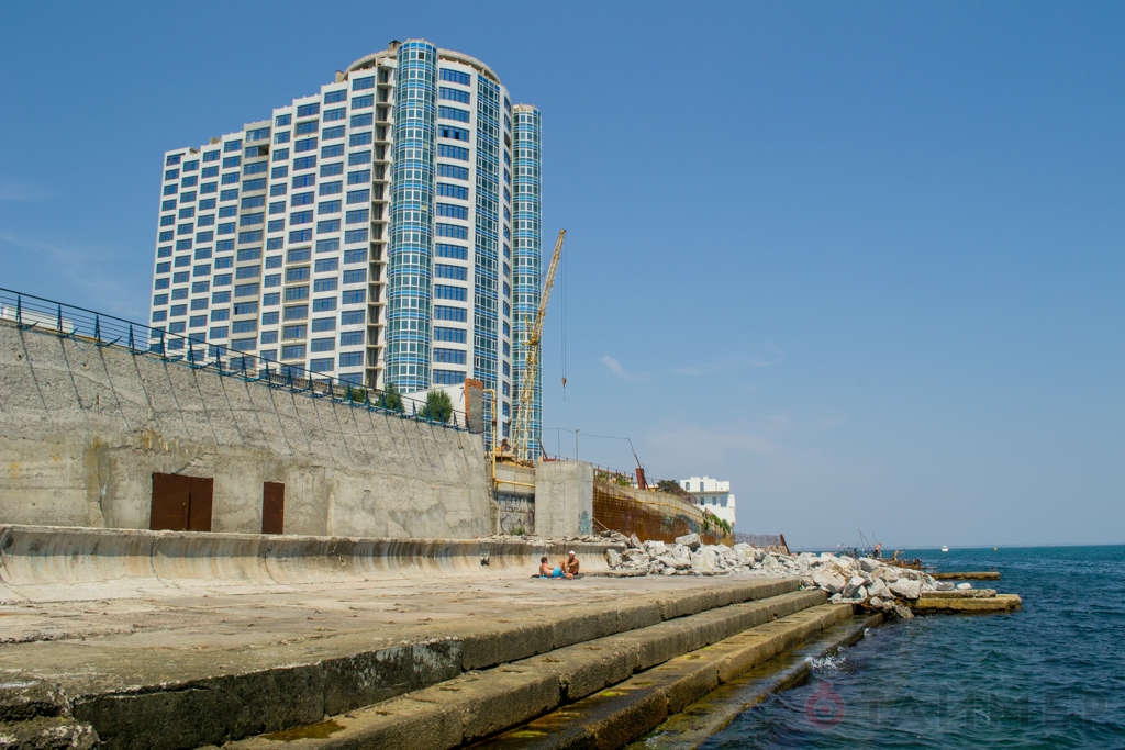На освобождённом от преграды участке плит уже появились первые отдыхающие. Впрочем, отдых здесь является занятием довольно-таки экстремальным: чтобы попасть сюда, требуется преодолеть устрашающие руины стены, изобилующие острой арматурой. Будем надеяться, что в ближайшее время данный участок побережья приведут в порядок.