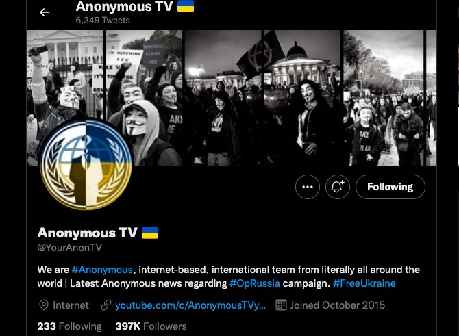 27 лютого вони твітнули: «Путін погрожує невинним людям ядерною зброєю. Ми завжди тут заради невинних. Багато сайтів gov (.)ru зламано! Опубліковано критичні документи!»