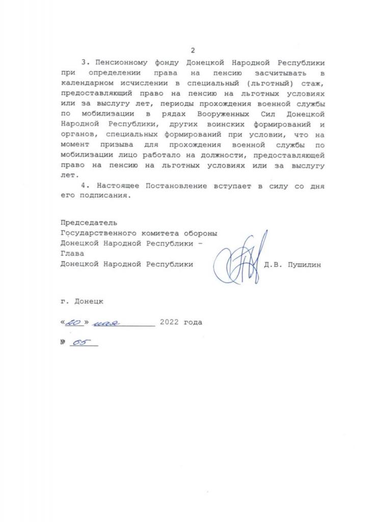 Данный «документ» предусматривает, что периоды прохождения военной службы по мобилизации в рядах «армии ДНР», других воинских формирований и органов, специальных формирований засчитываются в специальный (льготный) стаж, предоставляющий право на пенсию на льготных условиях или за выслугу лет, при условии, что на момент призыва для прохождения «военной службы по мобилизации» лицо работало на должности, предоставляющей право на пенсию на льготных условиях или за выслугу лет.