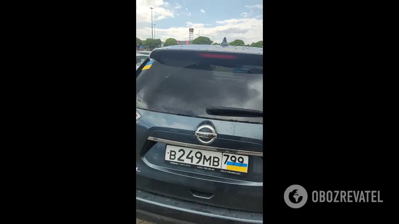Россияне в Польше заклеивают свой флаг на номерах машин украинским