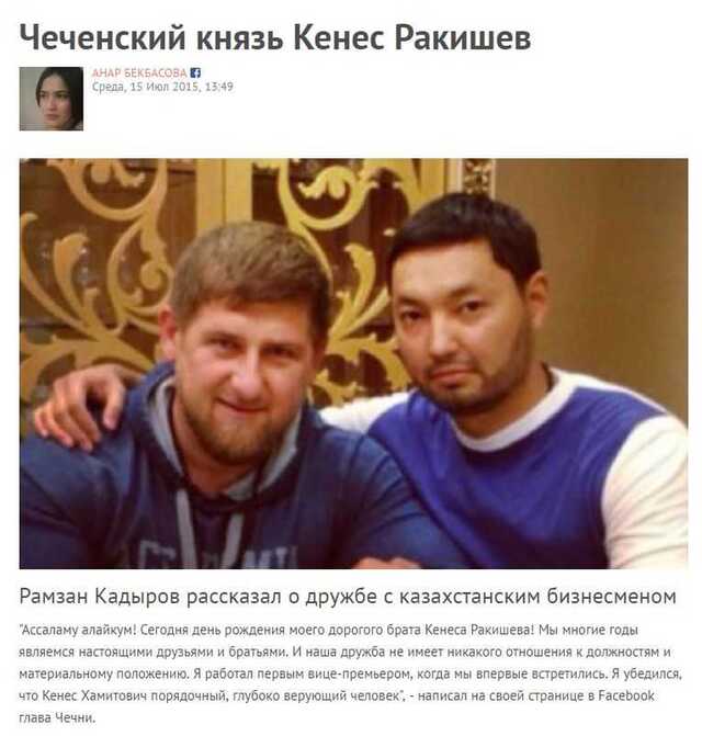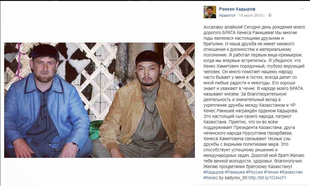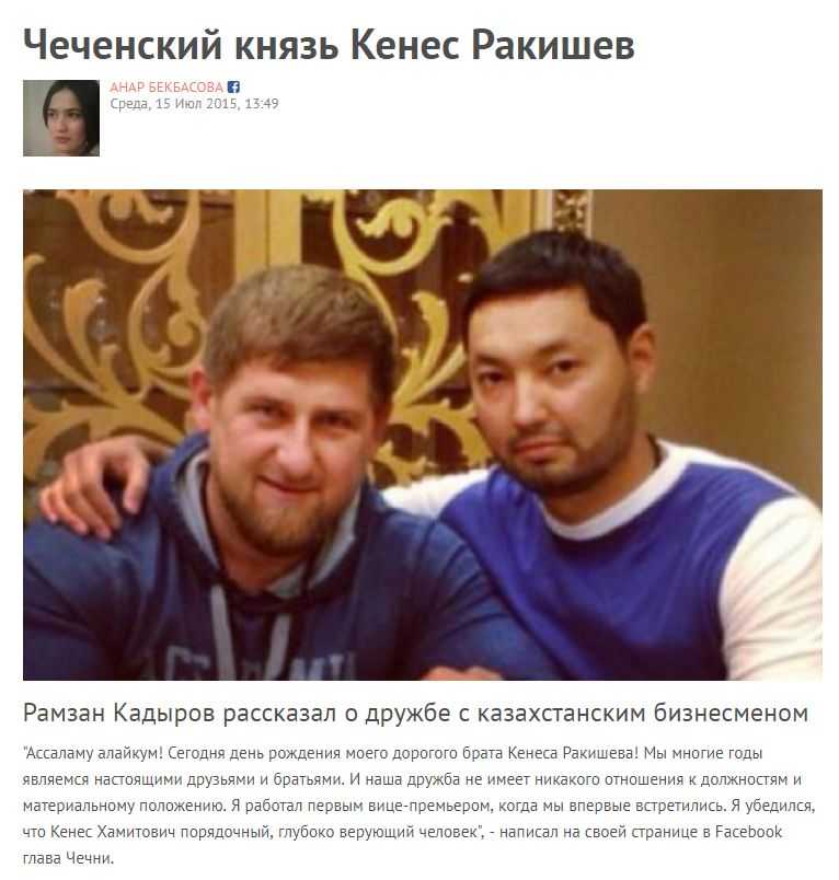 Среди наиболее тесных связей Ракишева в России – глава Чечни Рамзан Кадыров, который называет Ракишева своим «братом» и даже наградил именной наградой – «Орденом Ахмата Кадырова».