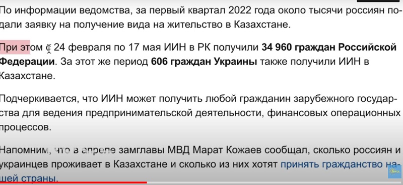 По состоянию на 17 мая вид на жительство в Казахстане получило 34 960 россиян. Что характерно, за тот же период – с 24 февраля по 17 мая – такой же статус Казахстан предоставил только для 606 граждан Украины, хотя число беженцев после начала войны в этой стране исчисляется миллионами, и значительная часть из них имеют родственников в Казахстане и пытается уехать к ним.