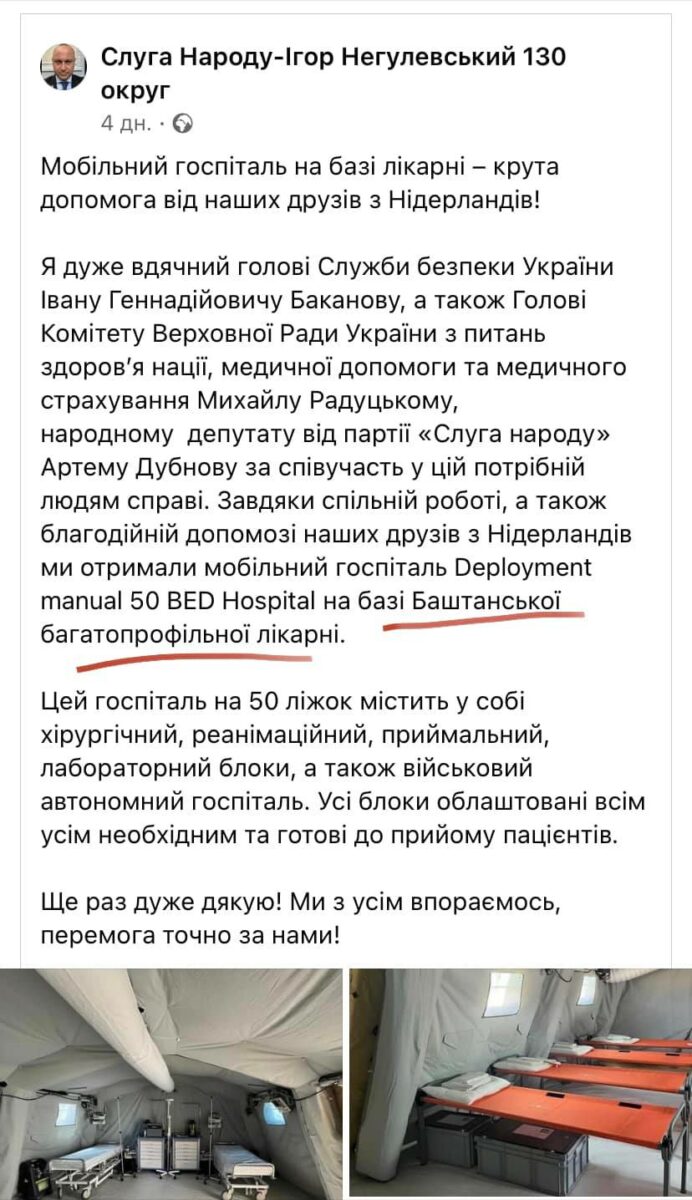 «Во время войны, в прифронтовой Николаевской области народный депутат Игорь Негулевский знаете о чем думает? О будущих выборах. И как бы переизбраться в Верховную Раду. Ему так это затмило разум, что он просто в Facebook выложил месторасположение мобильного военного госпиталя, обустроенного новой современной техникой нашими партнерами из Нидерландов», — пишет Лохматов.