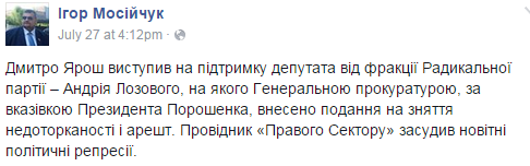 «Это месть Виктора Шокина за нашу жесткую проукраинскую позицию, за то, что мы против особого статуса Донбасса. Очень показательный момент: не на Бакулина, не на Левочкина, не на Шуфрича, не на Бойко представлений нет. Это говорит о том, что осуществляется реванш регионаловских недобитков, а патриотов преследуют. Но я ничего не боюсь, не собираюсь покидать страну», – ответил Лозовой. Дело об избиении им сельского головы, нардеп назвал целиком и полностью сфабрикованным. На его защиту тут же встало все вооруженно-радикальное украинское сообщество – от непосредственно Ляшка, до Яроша.