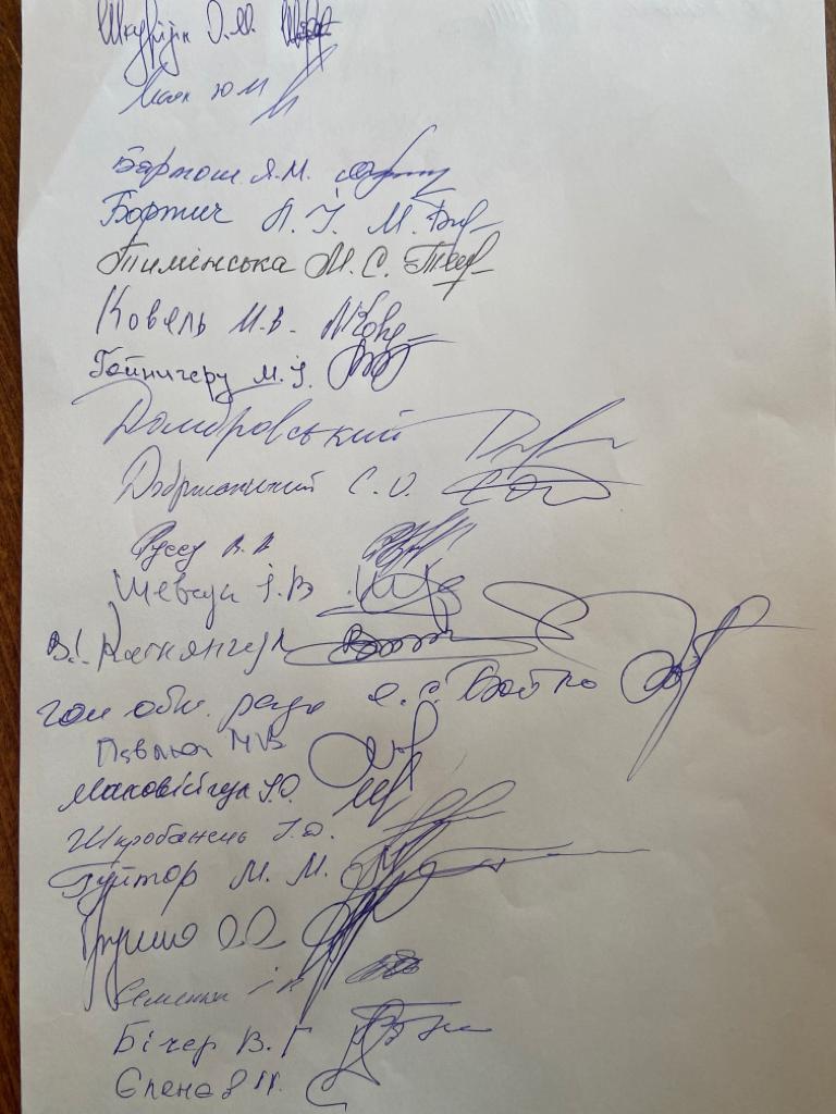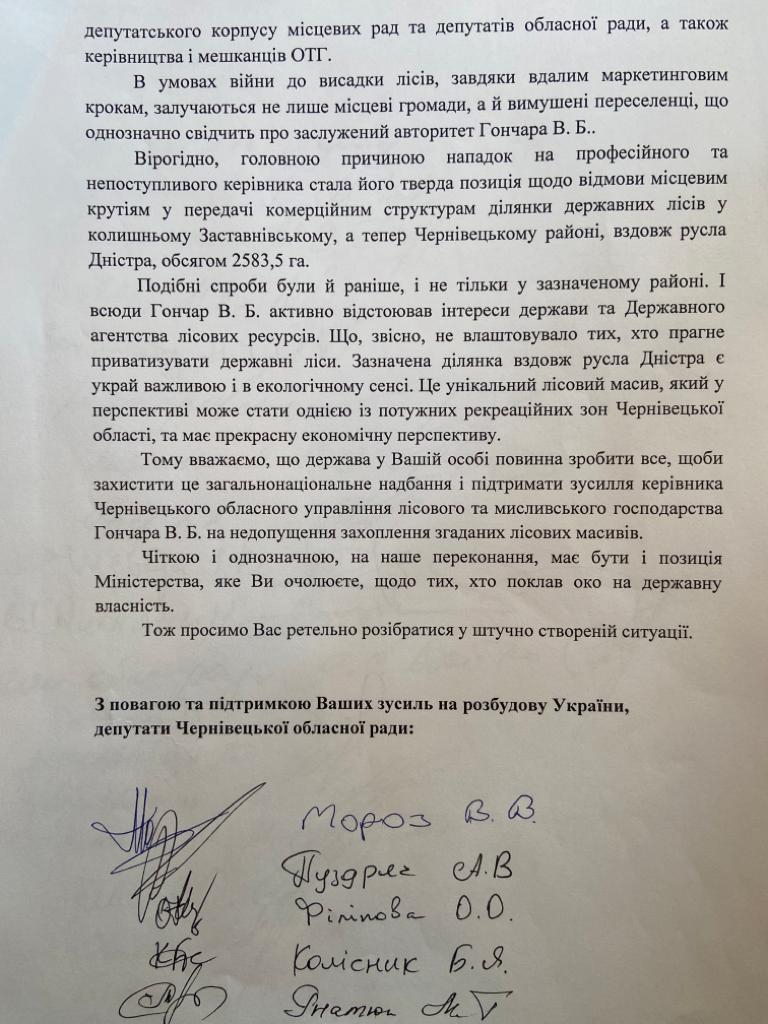 С таким категорически не согласились областные депутаты, которые прекрасно знают положение дел в буковинских лесах и о преступных манипуляциях областной власти. Они сразу же выстрелили коллективным обращением к господину Стрельцу, которое подписало убедительное большинство депутатского состава - 30 из 45 за вычетом призваных в ВСУ.