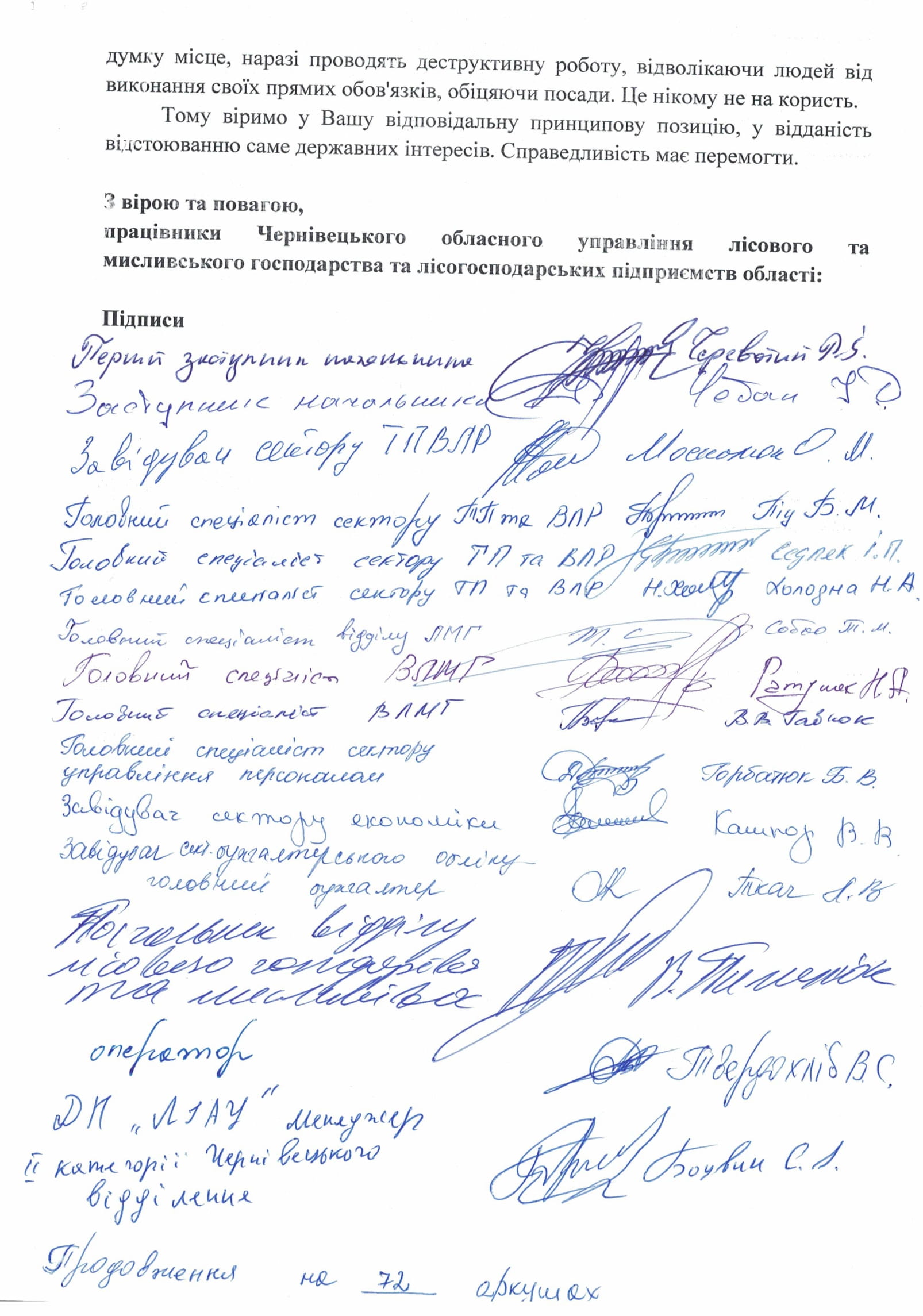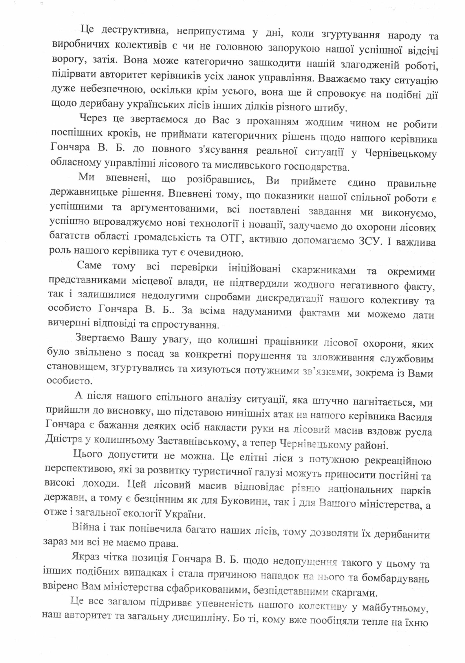 А также не допустить спровоцированного и незаслуженного увольнения авторитетного и проффесионального руководителя черновицкого лесного управления и разбазаривания государственных лесных масивов. Что есть главной целью упомянутых затейщиков. Но человека убрали.