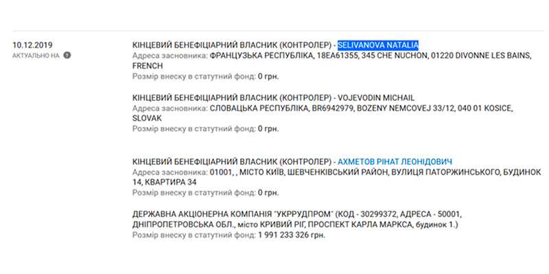 По сведениям сервиса Youcontrol, Наталья Селиванова и Михаил Воеводин засветились в составе бенефициаров акционерного общества «Криворожский железорудный комбинат», за который между Игорем Коломойским и Ринатом Ахметовым шел конфликт.