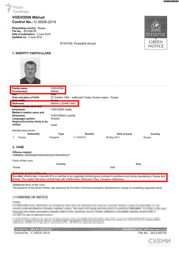 Однако еще за полтора года до того момента, в январе 2018 года, в Службу безопасности Украины поступило информирование Национальной полиции Украины, в котором говорилось, что, по данным Интерпола, Воеводин является одним из лидеров российской организованной преступной группировки «Лужниковская», которая занимается отмыванием доходов, полученных преступным путем, как на территории России, так и в странах ЕС.