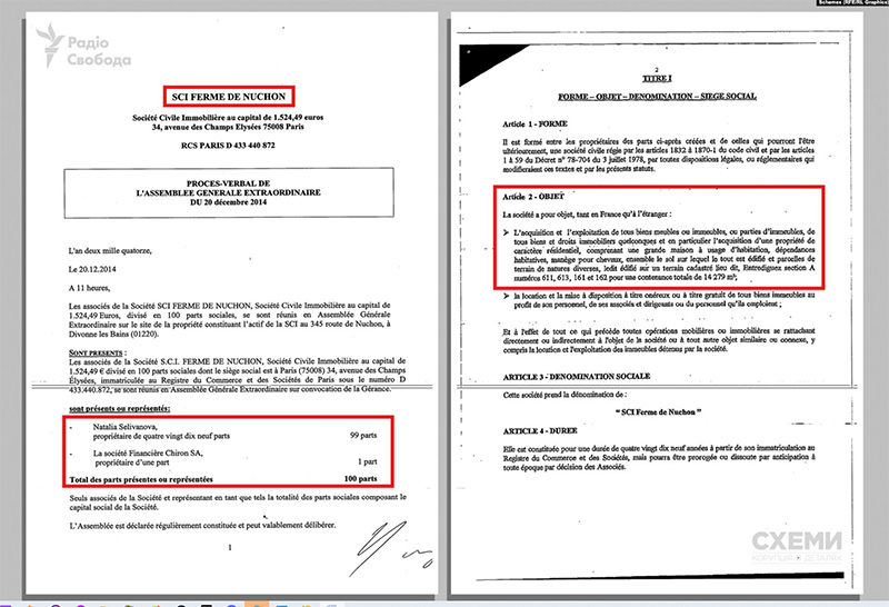 Судя по документам, для приобретения и эксплуатации этого имущества еще в 2000 году была создана специальная французская компания SCI Ferme de Nuchon. Согласно документам, 1% доли этой фирмы принадлежит люксембургской Financiere Chiron SA, а 99% – Натальи Юрьевне Селивановой, гражданской жене Михаила Воеводина, которая родилась 25 октября 1970 года в России, и зарегистрирована во Франции по адресу 345 Chemin Nuchon, 01220 Divonne-les-Bains (France). Она же является руководительницей французской SCI Ferme de Nuchon.