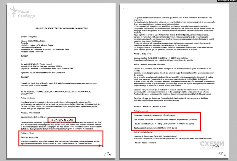 И шато, и имение с землями находятся в муниципалитете Дивон-ле-Бен на границе с франкоязычной Швейцарией, между подножием горы Юра и озером Женева. Для приобретения этой недвижимости в 2004 году была создана французская фирма Daria&Co, в которой 99% доли также принадлежит Наталье Селивановой. Она также указана и руководителем фирмы. Примечательно, что еще 1% доли записан на британскую Kilworth Trading Limited. Согласно данным британского реестра, ее владельцем является упомянутый ранее Евгений Гинер – бизнес-партнер Михаила Воеводина