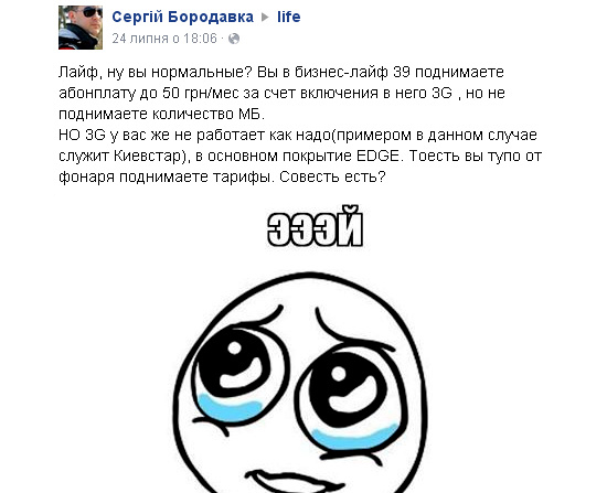 "Покриття 3G є не по всій території України, а тільки в певних населених пунктах. Це обмежує мене в користуванні послугою, бо я не постійно перебуваю в зоні покриття 3G. Цілеспрямовано було б такі пакети вводити після того, як вся територія нашої держави мала би покриття 3G. Політика вашої компанії обурює!" - восклицает один из абонентов компании на ее страничке в соцсети Facebook.