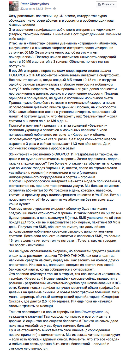 "На 2G-скорости 99% наших абонентов даже не успевали исчерпать предложенный лимит и думали, что интернет у них "безлимитный". Хотя тратили они по 5-15 Мб в день", - пишет он в Facebook. А теперь, когда интернет стал быстрее, старых лимитов пользователям уже, мол, явно не хватает.