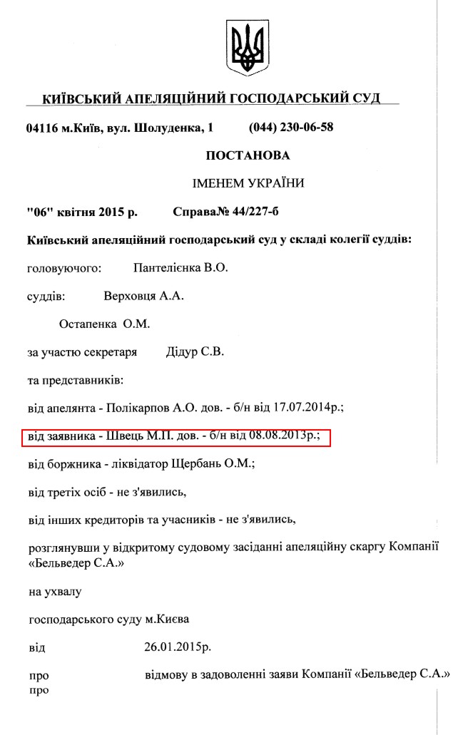 Но, колесо правосудия Януковича закрутилось. В августе 2013 г. в процессе рассмотрения дела о банкротстве компании «Бельведер Украина» был избран комитет кредиторов. Его возглавил представитель компании «Рафинад-Медиа». В конце января 2014 г. «Бельведер Украина» была признала банкротом. Начался ликвидационный процесс.